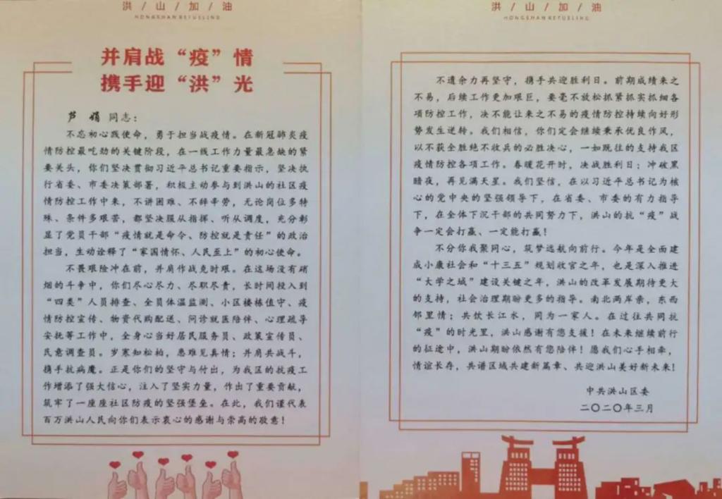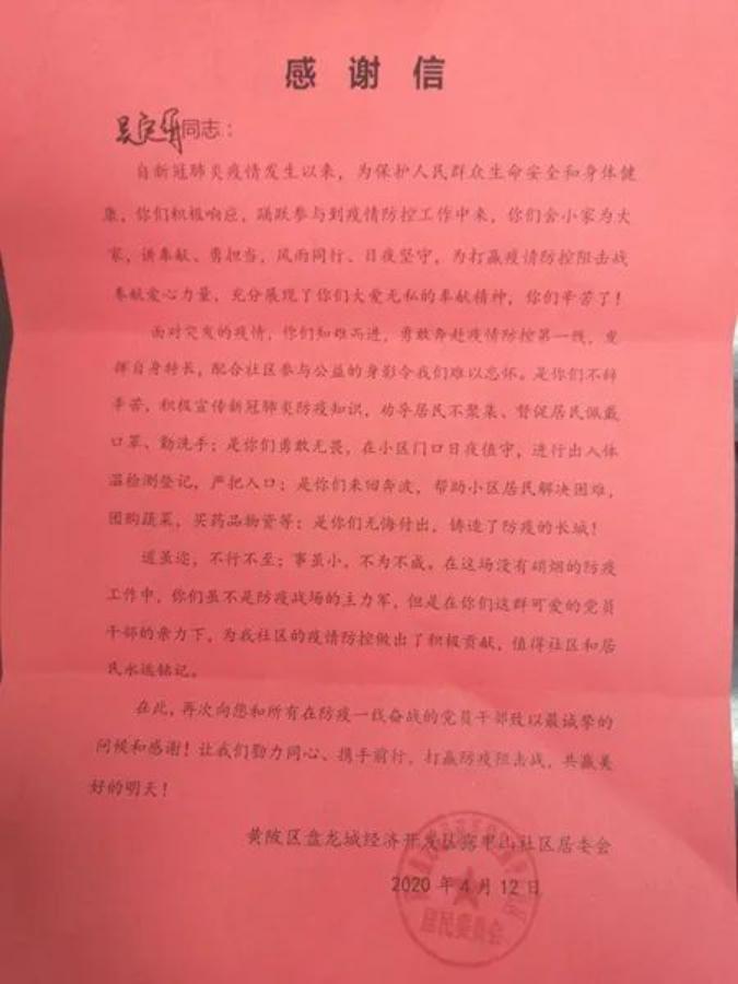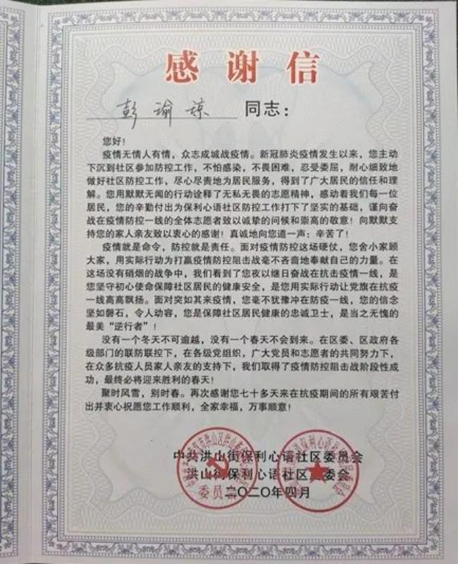 不畏艰险冲在前,并肩作战克时艰。在这场没有硝烟的斗争中,你们尽心尽力、尽职尽责,长时间投入到“四类”人员排查、全员体温监测、小区楼栋值守、疫情防控宣传、物资代购配送、问诊就医陪伴、心理疏导安抚等工作中,全身心当好居民服务员、政策宣传员、民意调查员。岁寒知松柏,患难见真情;并肩共战斗,携手抗病魔。正是你们的坚守与付出,为我们的抗疫工作增添了强大信心,注入了坚实力量,作出了重要贡献,筑牢了一座座社区防疫的坚强堡垒。